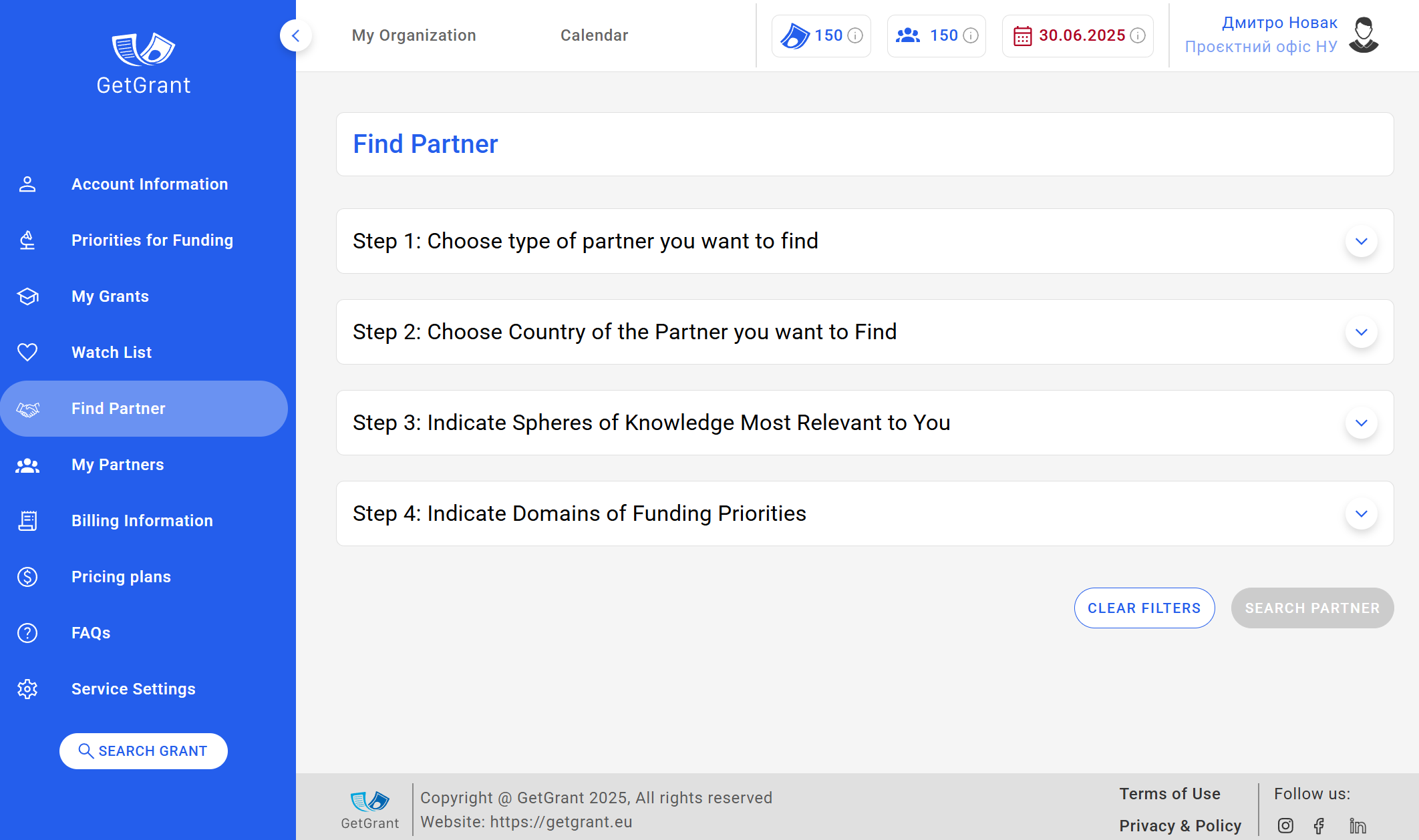 - Special platforms for finding partners (GetGrant Service) – for example, on our service, in addition to searching for grants, you can search for partners for your projects using an automated AI-based search system (with a database of more than 80,000 potential partners).